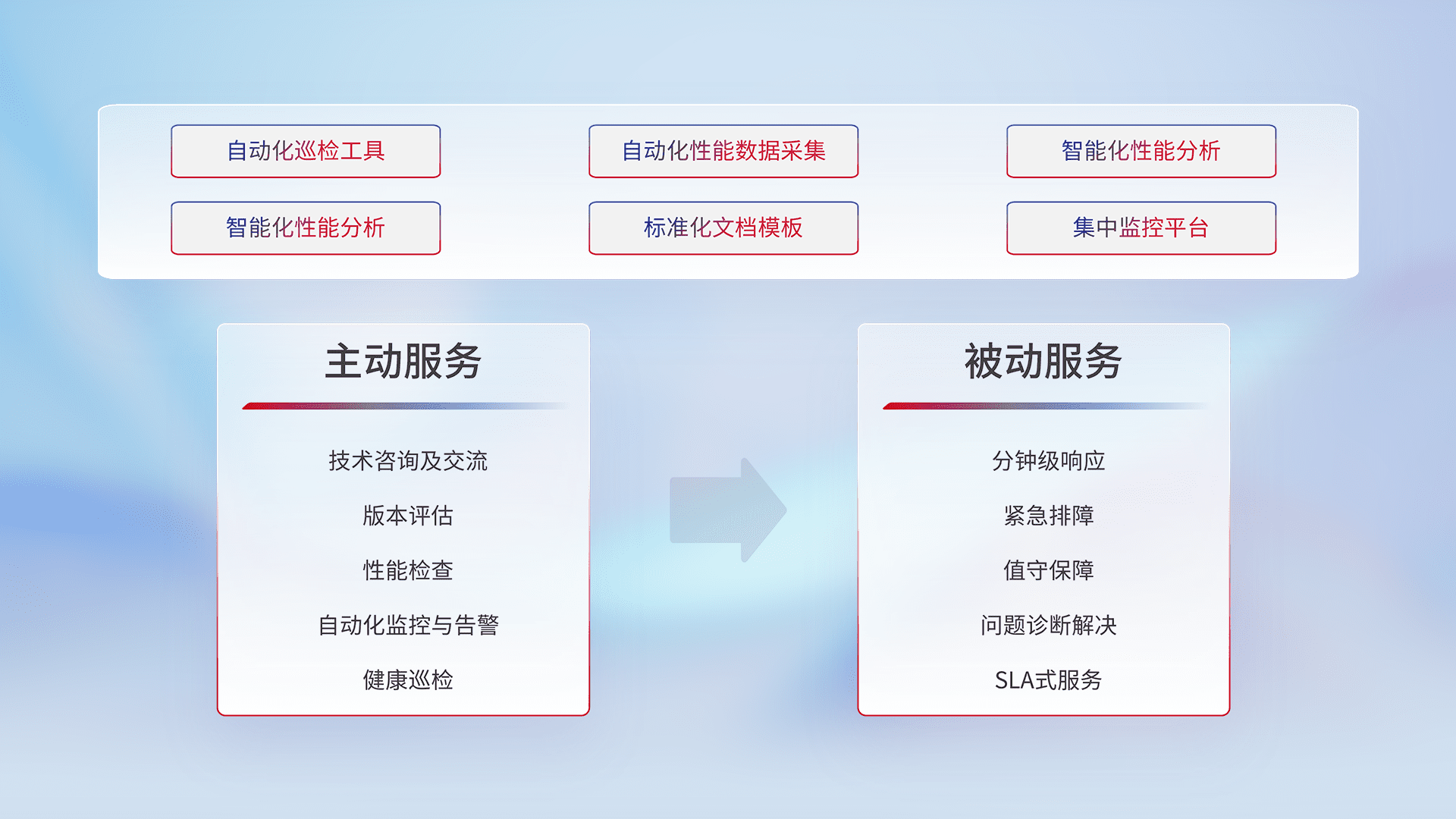 智能化工具和标准化文档,,保障服务质量,,提供主动服务(包含技术咨询、、、、版本评估、、、、性能检查、、自动化监控与告警、、健康巡检)和被动服务包含(分钟级响应、、紧急排障、、值守保障、、、问题诊断解决、、SLA服务)。。