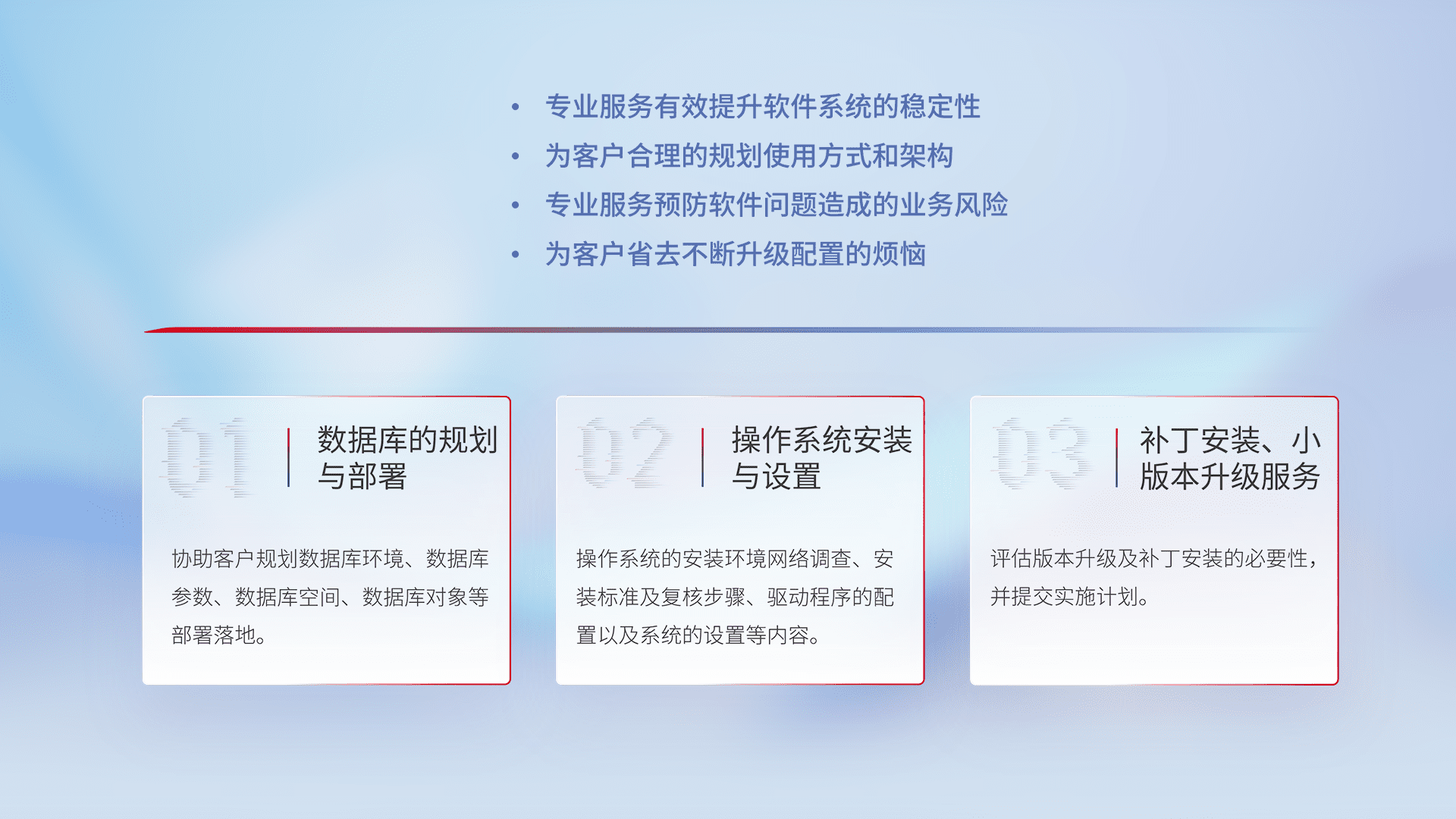 为客户提供软件规模升级、、快速部署、、、、按需配置的专业服务,,,,从数据库的规划与部署到操作系统的安装与设置,,再到补丁安装和小版本升级提供支持。。